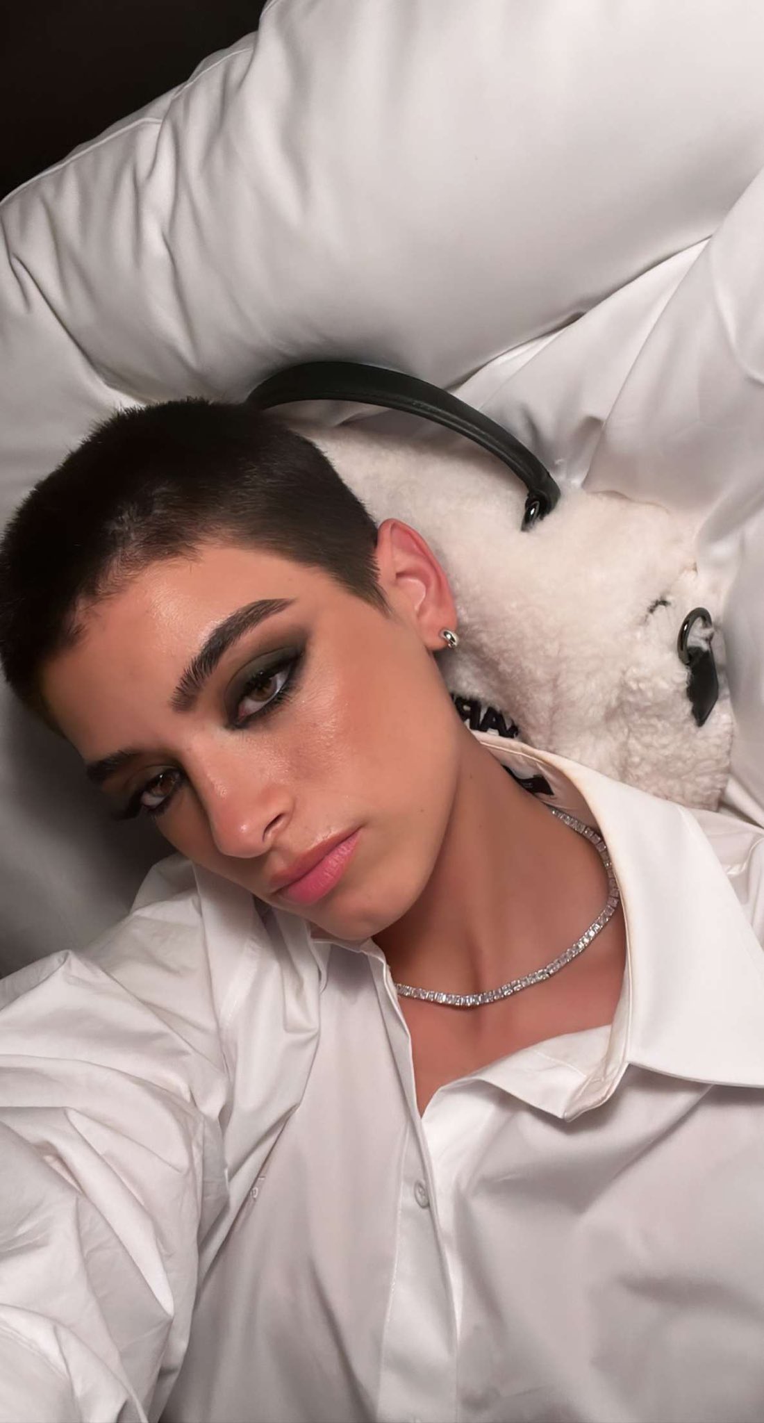 짧은 앞머리에 후드 드레스, 절제해서 착용한 주얼리