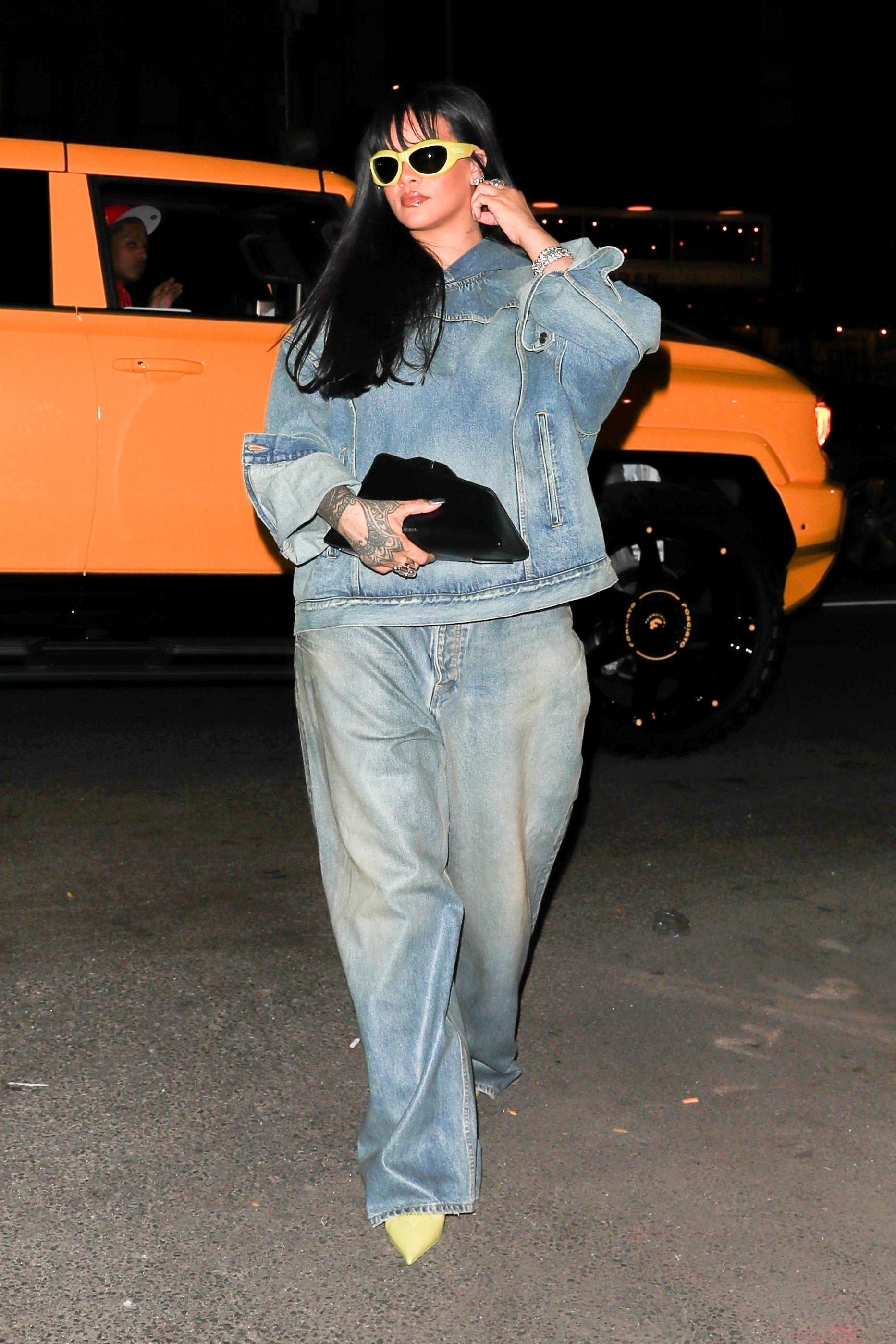 발렌시아가 청청 패션에 옐로우 컬러로 맞춘 보테가 베네타 선글라스, 프라다 슬링백 슈즈